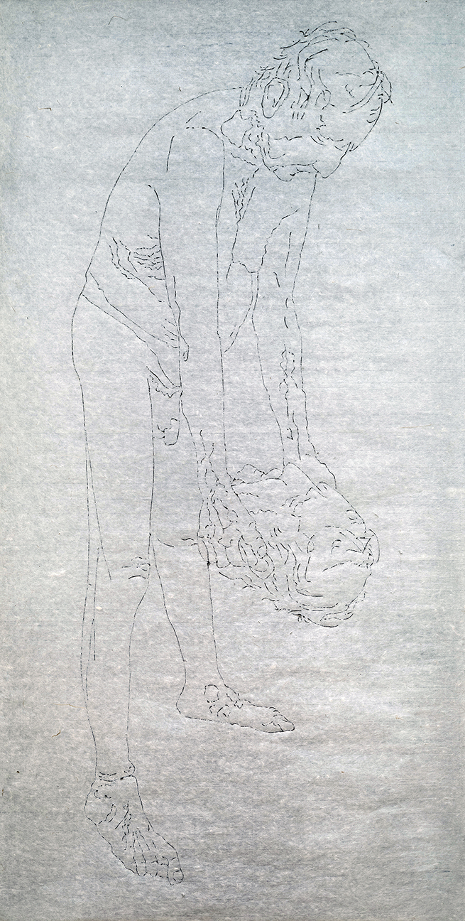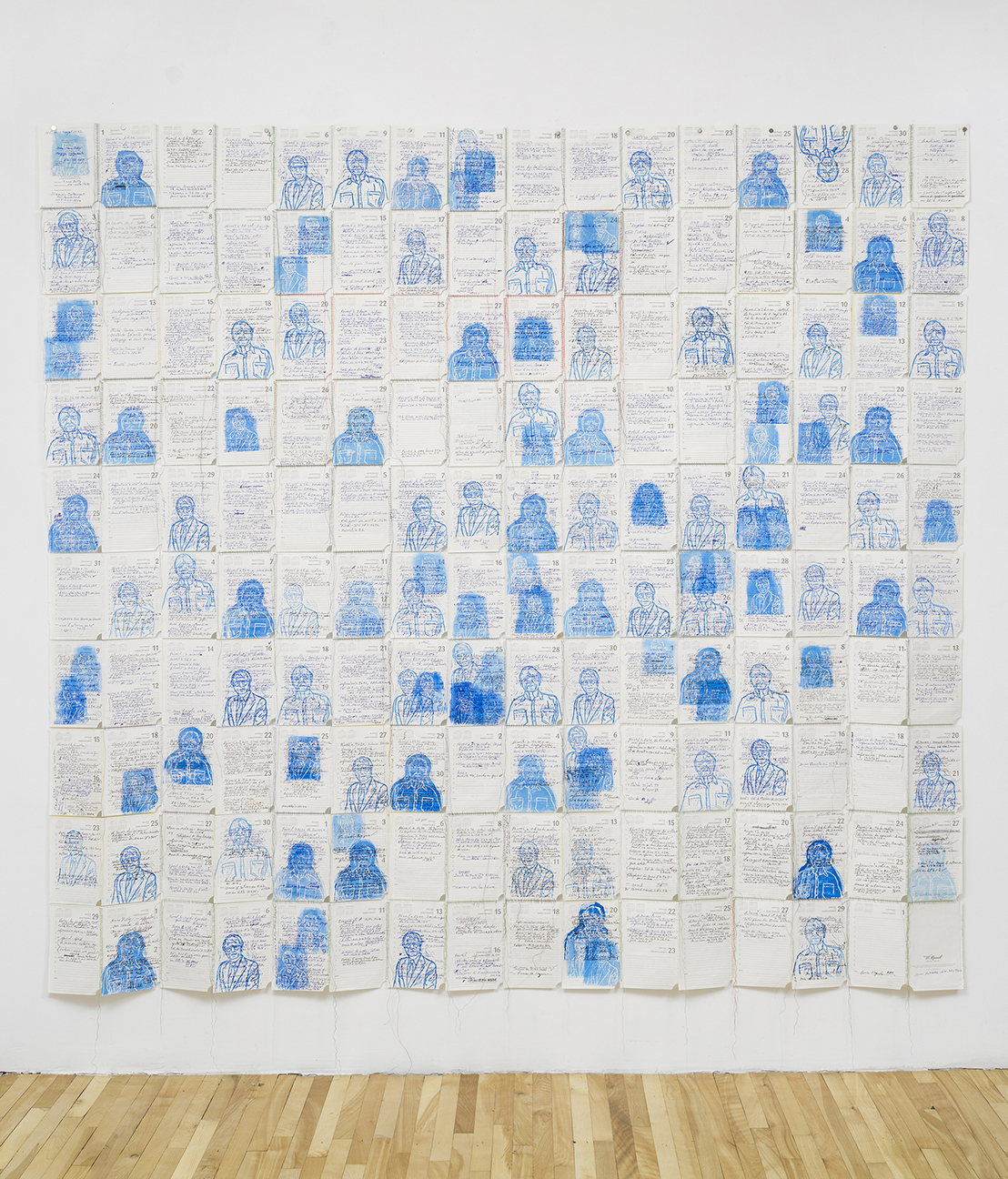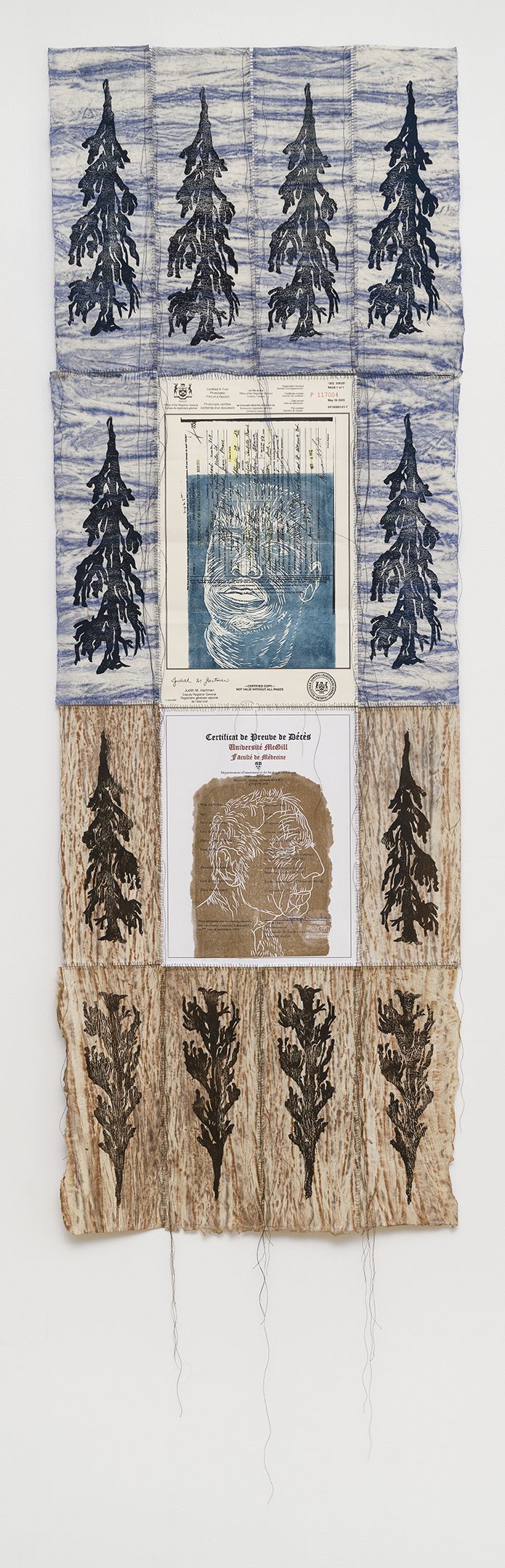 Interpellée par les aléas de l’âme humaine, Anne Billy présente dans cette série d’œuvres une histoire de collaboration et de tendresse dans laquelle se côtoient et se supportent jeunesse et vieillesse. Dans ce corpus, l’artiste présente des scènes intimistes qui suggèrent différentes formes de communication entre un petit-fils et son grand-père. Les silhouettes brodées des protagonistes vous amènent vers le monde symbolique de l’artiste autour de cette relation intergénérationnelle. À ce dialogue finement ficelé, s’ajoutent des courtepointes produites à partir des agendas du grand-père.